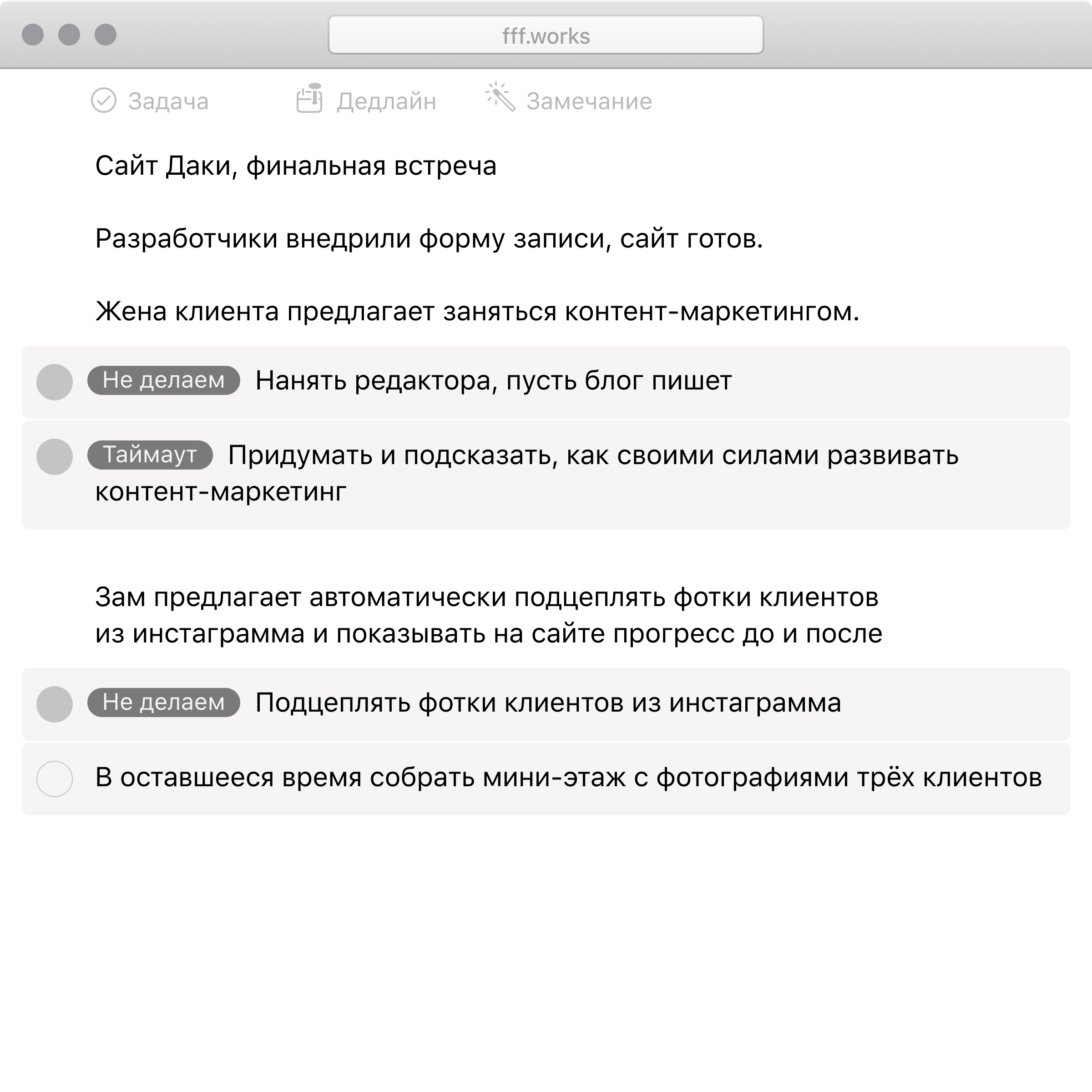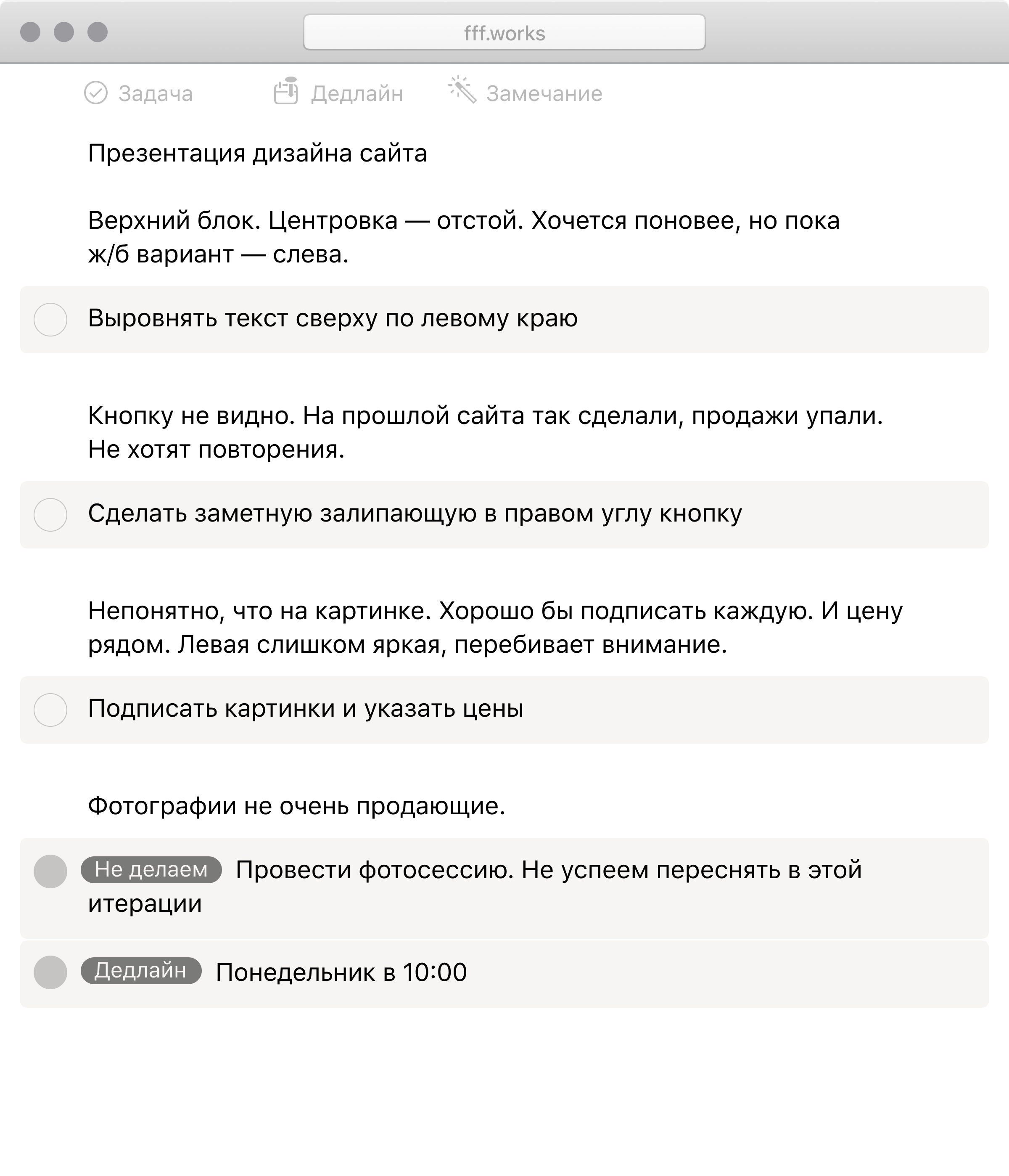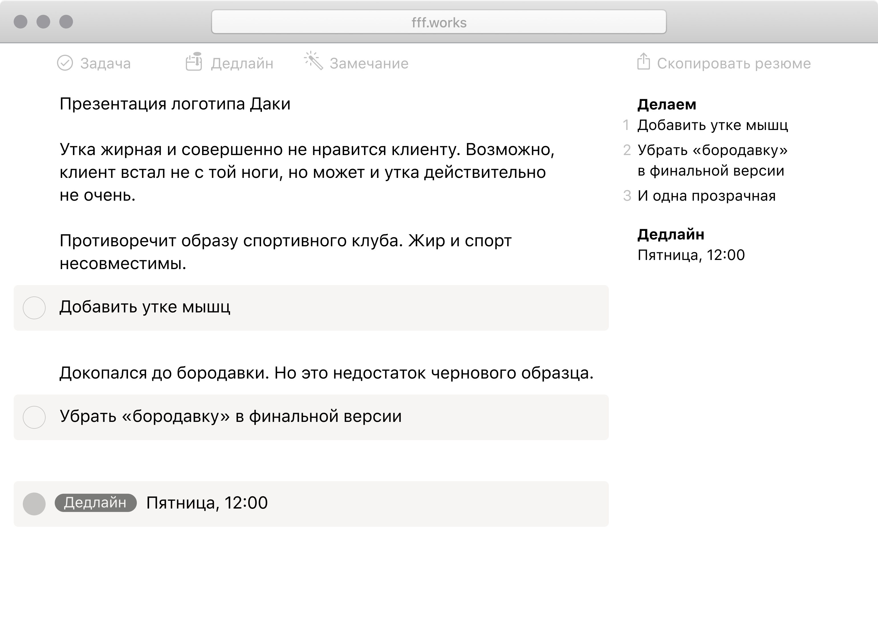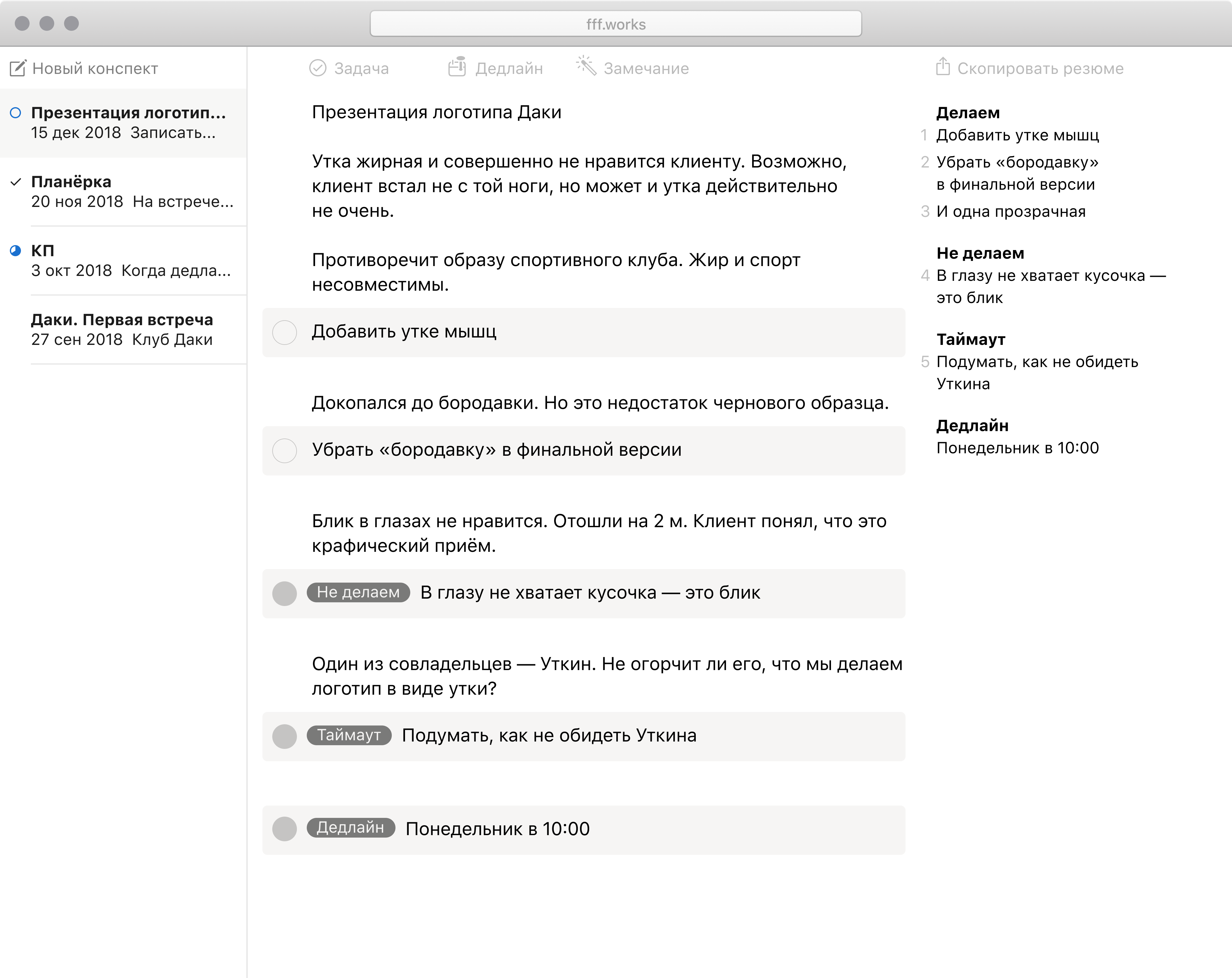 На переговорах бывает много замечаний, но не все нужно брать в работу прямо сейчас. «Конспект» подталкивает сразу принимать решения и успевать к дедлайну.